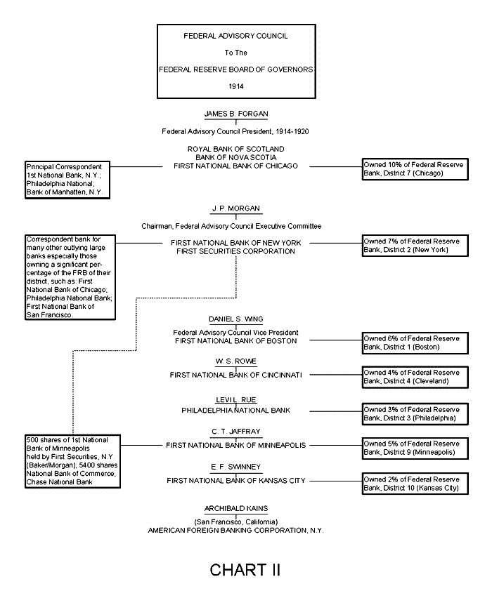 CHART II This chart shows the interlocking banking directorates which were revealed by the backgrounds of the officials selected to be the original members of the Federal Advisory Council in 1914. The principals were the same bankers who had been present or represented at the Jekyll Island Conference in 1910, and during the campaign to have the Federal Reserve Act enacted into law by Congress in 1913. These officials represented the largest stock holdings in the New York banks which bought the controlling stock in the Federal Reserve Bank of New York, and also were the principal correspondent banks of the banks in other Federal Reserve districts who, in turn, selected their officials to represent them on the Federal Advisory Council. ![]() | |