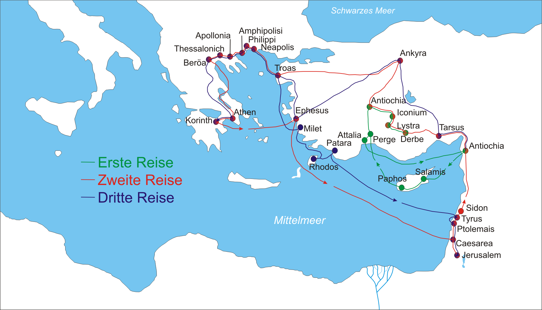 Parti d’Antioche, Paul traverse l’Asie Mineure par Tarse, Lystre, Antioche de Pisidie, et atteint le port de Troas. Il s’embarque ensuite pour la Macédoine,