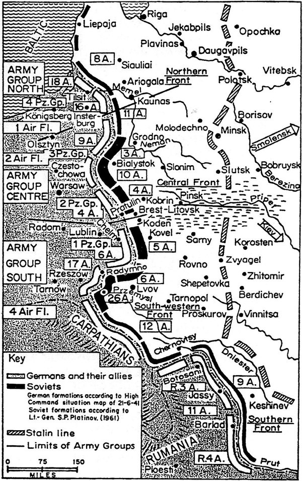 Military AlignmentHitler, herded into a corner and full of fear, in June 1941 decided to turn east, and attack the Soviet Union. In September 1939, as a result of the Red Army’s “war of liberation” in Poland, the new western border of the Soviet Union advanced in such a way that the so-called Belostok bulge formed in Byelorussia — a powerful wedge that, like a ship’s bow, broke into the territory occupied by Germany. The same thing happened in the Lvov region — there, another powerful wedge of Soviet territory formed. The Belostok and Lvov bulges were like two Soviet peninsulas in the German sea. Basic military logic dictated: if the Red Army intended to defend itself, it could not keep troops in the Belostok and Lvov bulges. Already, in peacetime, enemy troops surrounded the Soviet army on three sides in the bulges. The Soviet flanks were open and vulnerable. A sudden and decisive German attack on the flanks in these bulges would have cut off the best sections of the Red Army from the main forces and supply bases. In the event of an enemy invasion, such an alignment of Soviet troops inevitably and immediately would have led to catastrophe. That is exactly what happened in 1941. Before the German invasion into the territory of the Kiev military district, the most powerful Soviet front was deployed: the Southwestern Front. The three most powerful armies of that front were in the Lvov bulge. In peacetime, these three armies were already almost surrounded. Hitler only had to shut the trap on them. On June 22, the very weak 1st German Tank Group hit Lutsk, Rovno, and Berdichev, quickly cutting off all three Soviet armies in the Lvov bulge — the 12th (mountain), 6th, and 26th. The 1st Tank Group, faced with open, unprotected operational space, immediately went through the Soviet rear, crushing air bases, staffs, and hospitals. Here, in the rear, they found tremendous quantities of Soviet weapons, fuel, ammunition, foodstuffs, and medical supplies. The Germans seized truly remarkable trophies. The three Soviet armies in the Lvov bulge were left with a problem that had two solutions, both of which were catastrophic: either remain in the trap and wait for the 1st Tank Group to completely lock the encirclement, or run to the east, abandoning everything that cannot be carried. They ran. Soon, they were left without fuel and ammunition. The entire Soviet Southwestern Front crumbled from one rather weak blow. But that was not all: this same blow threatened the entire Southern Front. Having broken through to open space, the 1st German Tank Group could have freely chosen any direction: all roads were open. It could have struck the rear of the Southern Front. It could have headed to Kiev. If Kiev was being defended it could, instead of engaging in battle, have hit the metal-producing sites of the Ukraine: Dnepropetrovsk, Dneprodzerzhinsk, Zaporozhye. Once there, it could have reached the Crimea. It could have gone to the bases of the Black Sea fleet and taken them. Or it could have taken the largest hydroelectric plant in Europe, DneproGES. It could have crossed the Dnepr and taken Donbass — the largest coal region of the Soviet Union. It was also possible to continue to the North Caucasus toward the main petroleum sources of the Soviet Union. But Hitler was preparing for war in a very strange manner: so many open directions, and he only had one tank group against all of Ukraine, Moldavia, Crimea, Donbass, Don, North Caucasus, and Trans-Caucasus — with only 799 obsolete and worn-out tanks. The First Tank Group fought fierce battles on the western bank of the Dniepr River, then crossed the Dniepr and joined the Second Tank Group. This was how four armies of the Soviets were encircled; 664,000 prisoners were taken, and with them huge quantities of arms and supplies. But the Germans paid for this grandiose bounty by losing the tempo of their attack: it happened in September, so they could not start moving toward Moscow before October, which meant rain, dirt, and mud. No blitzkrieg was possible in the remaining months of 1941. In Byelorussia, the Red Army had an even worse time. The Western Front had four armies. The main forces of the front were concentrated in the Byelostok bulge. Two German tank groups struck the undefended flanks and linked east of Minsk. The 3rd, 10th, and parts of the 4th and 13th armies, all together almost thirty divisions, found themselves in a pocket. The Western Front collapsed even quicker than the Southwestern and the Southern Fronts. Could it be that before the war General Zhukov did not understand that one cannot herd huge numbers of troops into bulges that become traps?