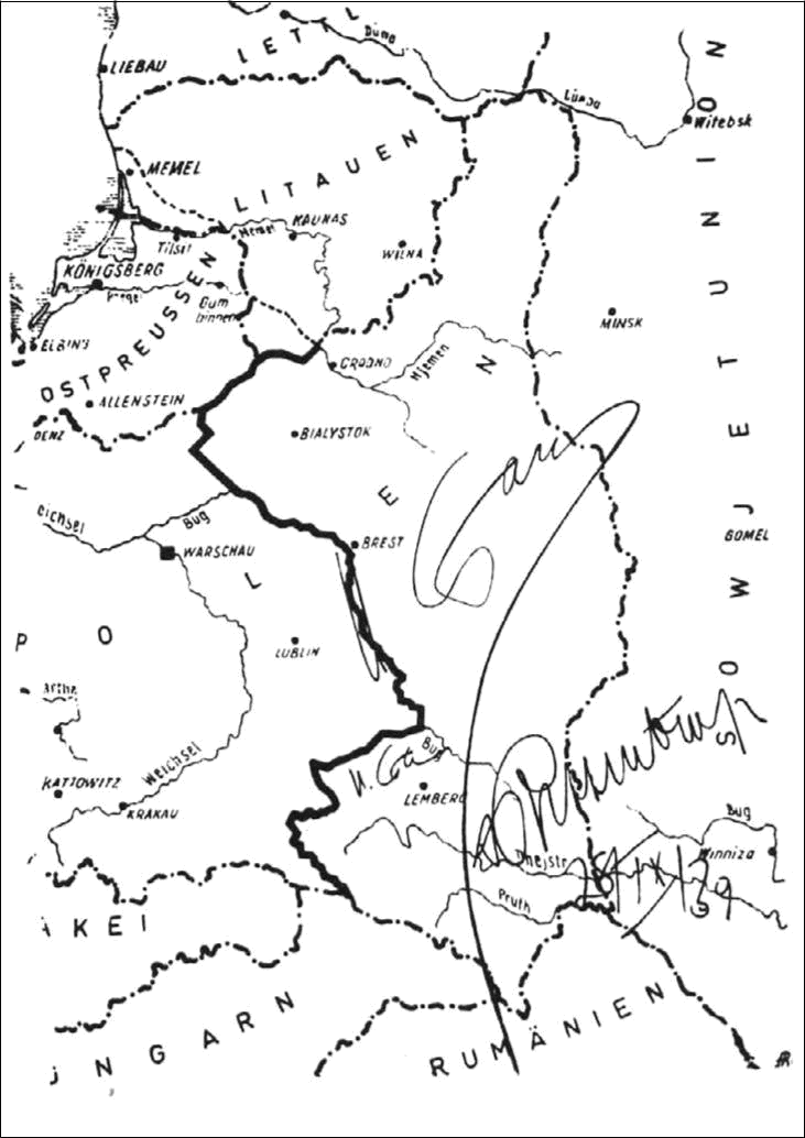 Since Hess had flown to England in May of 1941, and had been taken prisoner by the British a month before Hitler attacked the Soviet Union, Dr. Seidl was confident he could gain an acquittal on the charges of war crimes and crimes against humanity. Since Hess was in captivity in England he could have had no part in the atrocities against the Jews. The first two charges would be more diffcult to refute since Hess, as Hitler’s deputy, had discussed with the Fuehrer the events that led to war, and until May 1941 Hess had agreed with all of Hitler’s decisions. In Hess: The Man and His Mission (London: David Bruce and Watson, 1970), the Czech-born journalist, diplomat, and writer J. Bernard Hutton described how Dr. Seidl learned of the secret protocol to the Hitler-Stalin pact signed by Soviet foreign minister Vacheslav Molotov and German foreign minister Joachim von Ribbentrop, which implicated Stalin in war crimes. After a long and frustrating interview with Hess, who insisted he did not want to defend himself with a lawyer, Dr. Seidl was preparing to leave the prison. In the prison yard he overheard Reichsmarschall Hermann Goering and Von Ribbentrop talking. Von Ribbentrop offered an astonishing piece of information to Goering. He said that when he visited Moscow in August 1939 to arrange the German-Soviet treaty with Molotov, he had also signed a secret treaty which was not made public. Von Ribbentrop told Goering: “ This secret agreement defined spheres of interest in the event of any war.” The two foreign ministers had drawn a line upon a map along the Vistula and the Bug, the two rivers that divide Poland. They had agreed that, should war come, the territory to the west of the two rivers should become a German sphere of interest, and the territory to the east would be under Soviet control. The Soviet sphere included Finland, Estonia, Latvia, Lithuania, the eastern part of Poland, and certain areas of Romania. Von Ribbentrop also told Goering that the Russians had assured him, since his arrest, that it would be made easier for him if he did not talk about this secret agreement in court. Stalin clearly wanted to keep his secret pact with Hitler — to carve up and share Poland and the Baltic states — from being made public at a time when the Russians were part of an international military court passing sentence on war crimes that included conspiracy to wage aggressive war and crimes against peace. Dr. Seidl realized at once the significance of this secret pact to his client. After the military action of Germany and the Soviet Union against Lithuania, Latvia, and Estonia in June 1940, both Germany and the Soviet Union had denied that any political agreement existed, apart from the German-Soviet treaty concerning boundaries, which was concluded on August 23, 1939. It followed that if Dr. Seidl could prove such a secret plan did exist then Stalin and the Soviet Union were as guilty of waging aggressive war as any of the Nazis in the dock. Dr. Seidl would be able to argue that his client should be found not guilty or else Stalin and other Kremlin men should join him in the dock, explained Hutton. Dr. Seidl set out to find another witness to the secret protocol signing besides Von Ribbentrop. After a difficult search he managed to come across Dr. Friedrich Gaus, who had been undersecretary of state in the German foreign ministry and had accompanied Von Ribbentrop to Moscow for the treaty signing. “Was there such a secret agreement?” Dr. Seidl asked. “Yes,” confirmed Dr. Gaus, “I remember it clearly.” When asked where a copy could be found, Gaus said he had no idea since to his knowledge all the important files of the German foreign ministry had been microfilmed and surrendered to American officials. Dr.Seidl needed documentary evidence to make his case. When his efforts to find the document by going through normal bureaucratic channels failed, he spread the word of his search to all the high-ranking American officers he met socially and told them about the specific document he was looking for. One evening as he was leaving the court, an American officer, whom he did not know, approached him and asked in German, “Are you Dr. Alfred Seidl?” The lawyer nodded. As Hutton wrote, “ The American introduced himself. He then handed Dr. Seidl a plain sealed envelope. ‘ This is something that may interest you,’ he said. Dr. Seidl ripped open the envelope, his fingers trembling as he leafed through the contents. It was a copy of the agreement between Molotov and von Ribbentrop that he was searching for. The American officer discreetly disappeared.” After studying the document Dr.Seidl saw that it was not a photostatic copy and had no official seal. He gave the document to Dr. Gaus, who said it seemed to him to be a true copy of the secret agreement reached between Molotov and von Ribbentrop. Dr. Gaus willingly signed an affidavit: