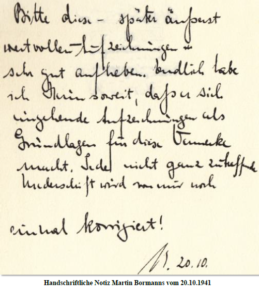 In jedem Menschen lebt das Ahnungsvermögen, was das Walten dessen angeht, das man Gott nennt, [hs. Zusatz Bormanns: Nämlich das Walten der Naturgesetze im gesamten Universum.] Dieses Ahnungsvermögen hat die Kirche sich dienstbar zu machen verstanden, indem sie den mit Strafe bedroht, der das nicht glauben will, was sie geglaubt wissen möchte.